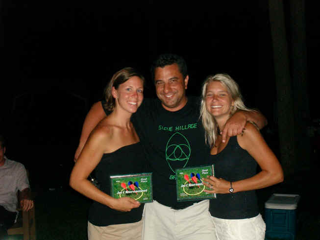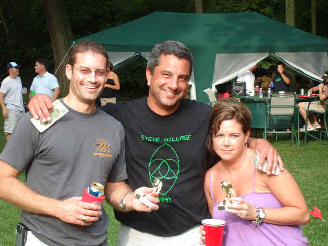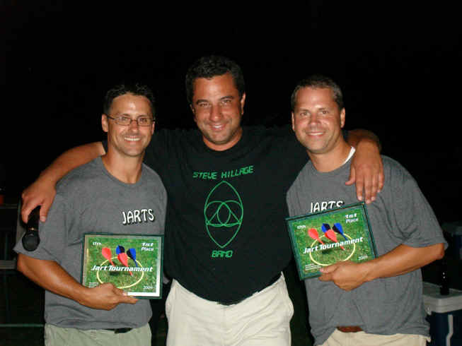 2009 17th Annual Jarts Tournament This year's Jarts Tournament included a shorter field of 60 players due to a massive rain storm that lasted from 9am to 2pm. There were four courts playing triple elimination brackets with the winners from each bracket going to The Final Four. The winners of courts 1 and 4 played a best of three series as did the winners of 2 and 3. The losers of those matches played a one-game consolation game for third place while the winners played a best of three series. For the first time ever we had a female appearance in the championship game and it just so happened to be an all-female team. We finished under the lights around 10pm. Once again, we'd like to thank All-Around Awards, who provided our 1st and 2nd place plaques and last place trophies. Food was prepared by the Pig Team (Greg Blankenship, Jason Pierce and Dane Widney). Thanks guys!! For more pictures of July 11th, click here.